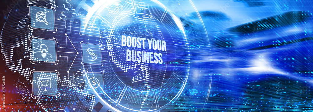 Business, Technology, Internet and network concept. Young businessman shows the word: Boost your business. 3d illustration #1737266856