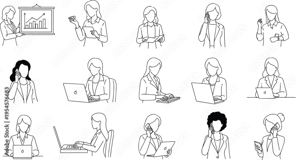 Business woman line art collection, office activities set, female professional working poses, communication and technology concepts, corporate lifestyle vector illustration #1954576683