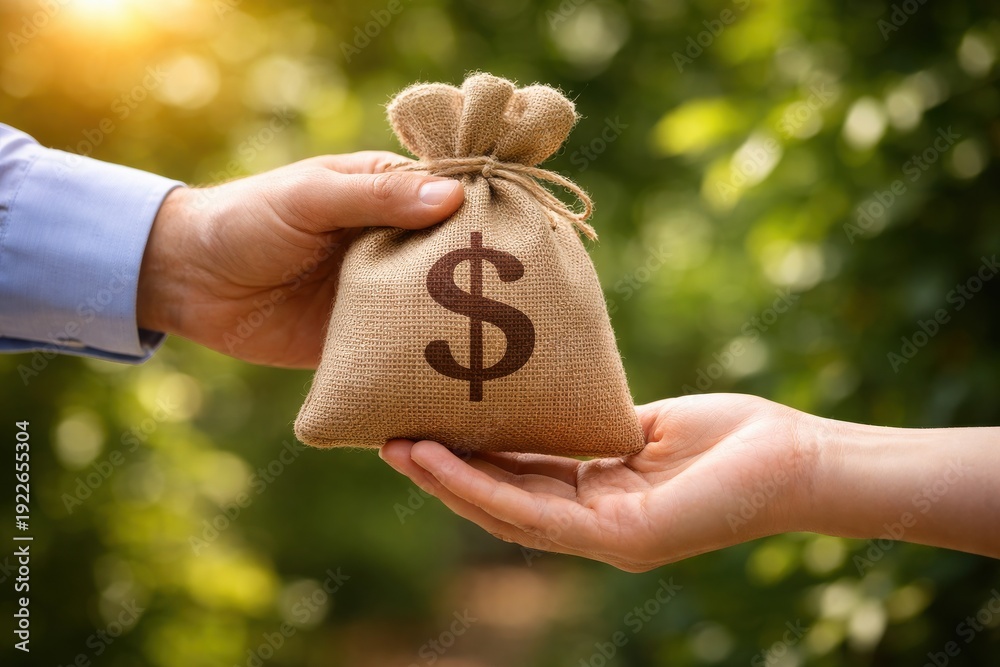 Businessman hand giving money bag to person against green background during sunset outdoors #1922655304