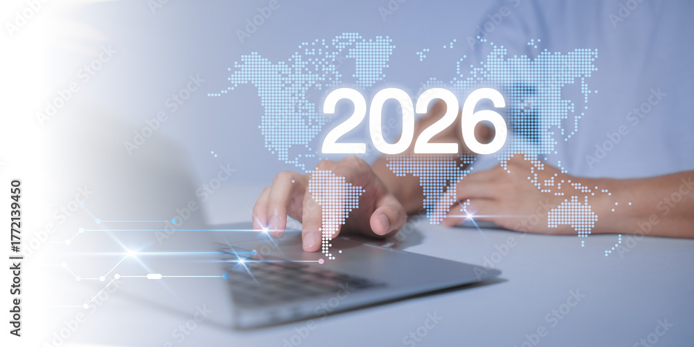 Businessman hand presenting with digital 2026, upward arrows. Futuristic concept of business growth, digital strategy, and vision planning #1772139450