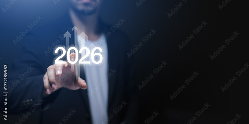Businessman hand presenting with digital 2026, upward arrows. Futuristic concept of business growth, digital strategy, and vision planning #1772139563