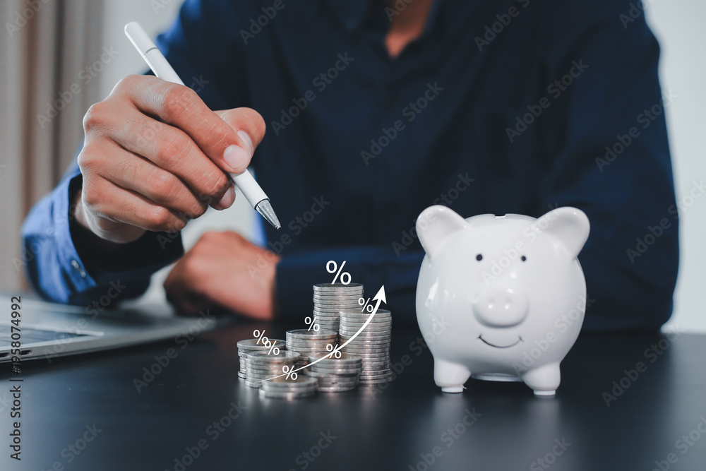 Businessman hand putting a coin into a white piggy bank for saving money concept. #1958074992