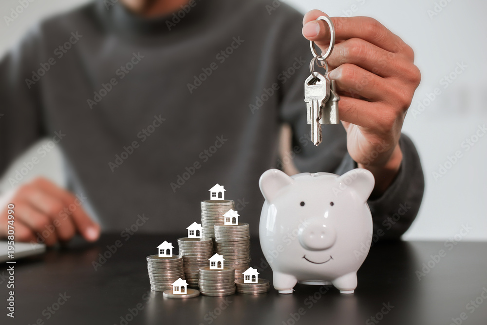 Businessman holding keys and putting a coin into a piggy bank with house models, saving for new home and property investment concept. #1958074990