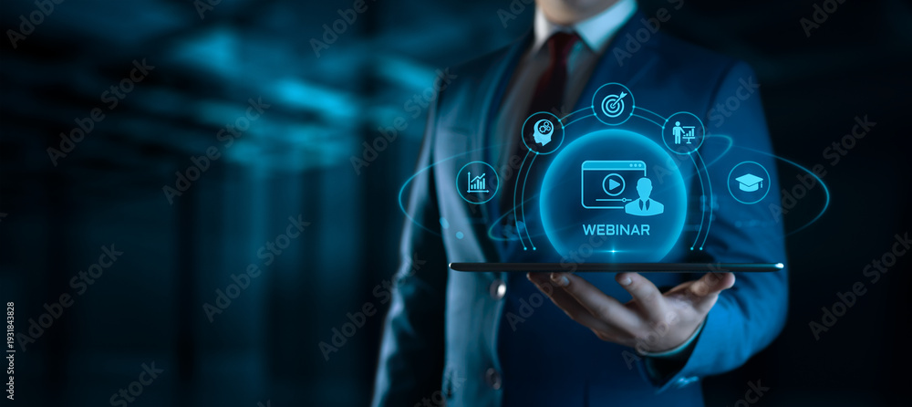 Businessman Holding tablet with Webinar Icons on Screen. E-learning and Education Concept #1931843828