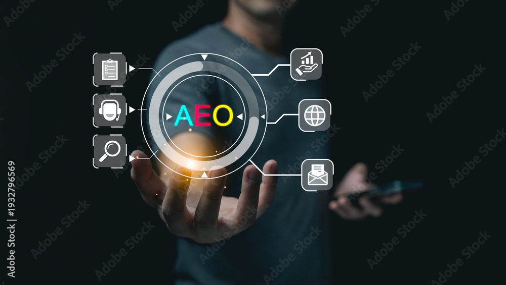Businessman holding virtual AEO or Answer Engine Optimization digital hologram with marketing and technology icons on dark background #1932796569