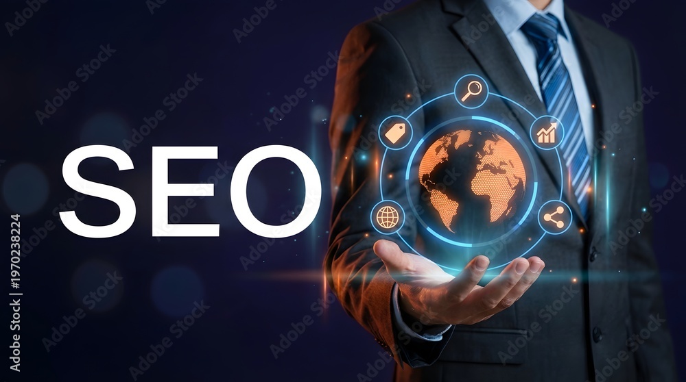 Businessman Holding Virtual SEO Icon – Website Performance Analysis and Search Ranking Concept #1970238224