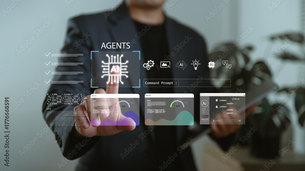 Businessman interacting with futuristic virtual AI agents interface, displaying data dashboards, automation icons, and command prompt for smart technology and digital transformation concept. #1776668591