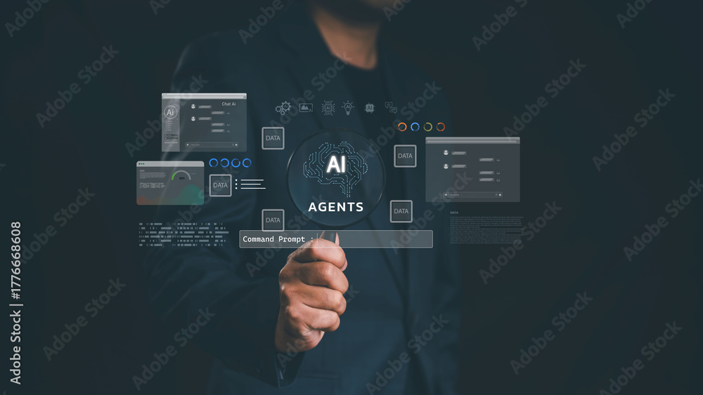 Businessman interacting with virtual interface of AI agents, data analytics, and command prompt system, representing artificial intelligence technology in modern business solutions. #1776668608