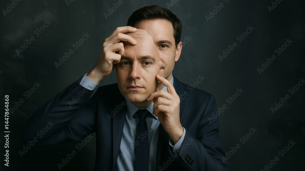 Businessman placing artificial face over real face symbolizing deepfake identity manipulation multiple personality and digital deception concept #1447864868