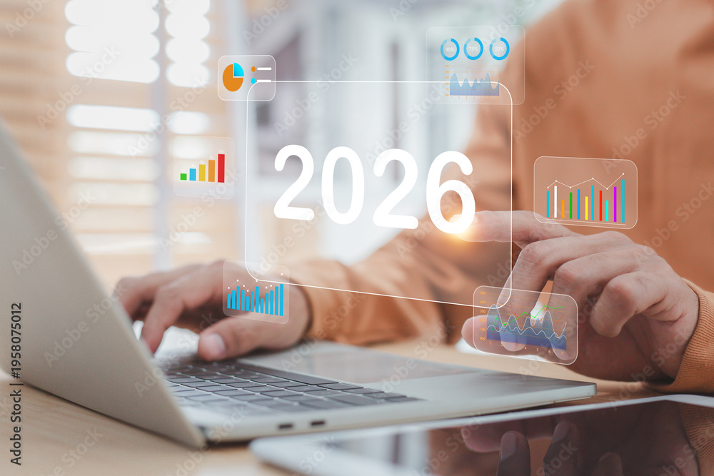 Businessman planning business strategy for year 2026, analyzing financial growth and future performance. #1958075012