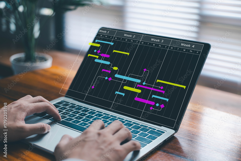 businessman schedule plan management shows a timeline Gantt chart in technology online. concept project planner in software, work update, and workflow, manage milestones, appointment staff of business #1792205198