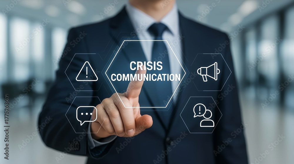 Businessman selecting crisis communication strategy concept with virtual interface showing alert message megaphone and people icons in corporate office environment #1775263671