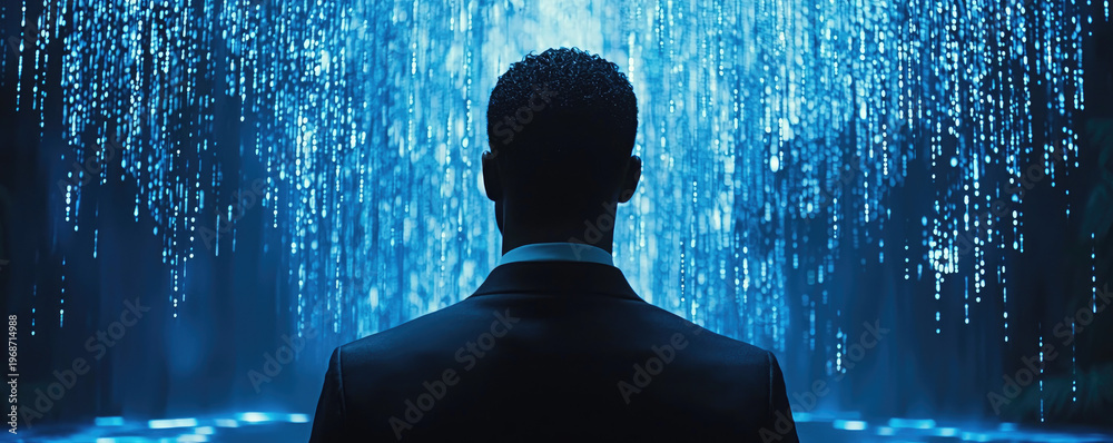 Businessman Silhouette Facing Futuristic Digital Data Rain Installation in Blue Light Technology Concept #1968714988