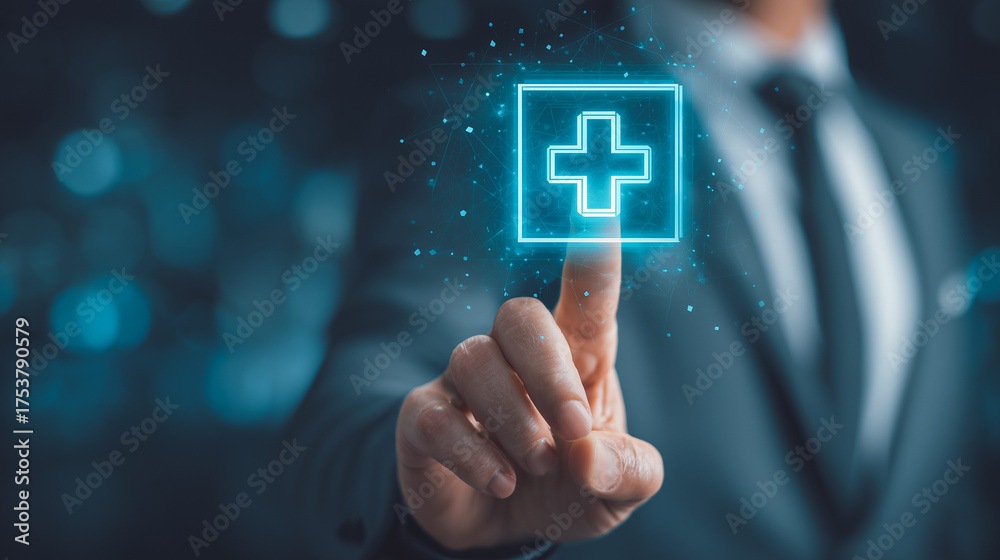 Businessman touching digital healthcare icon with glowing medical cross, representing innovation in digital health services and medical technology. #1753790579