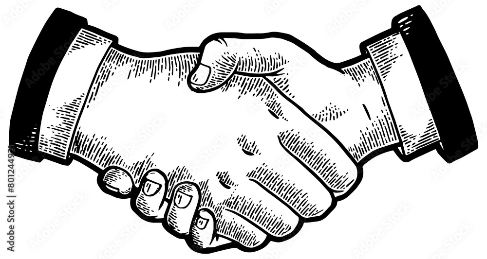 Businessmen handshake sketch engraving PNG illustration. Scratch board style imitation. Black and white hand drawn image. #801244921