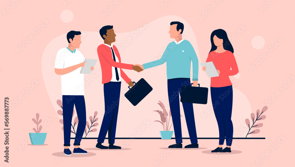 Businesspeople handshake - Two teams of people shaking hands on agreement and business deal. Flat design vector illustration #569887773