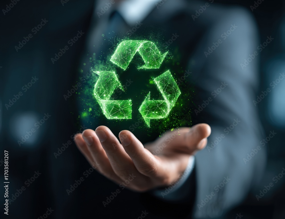 Businessperson holds a glowing, abstract recycling symbol #1703581207