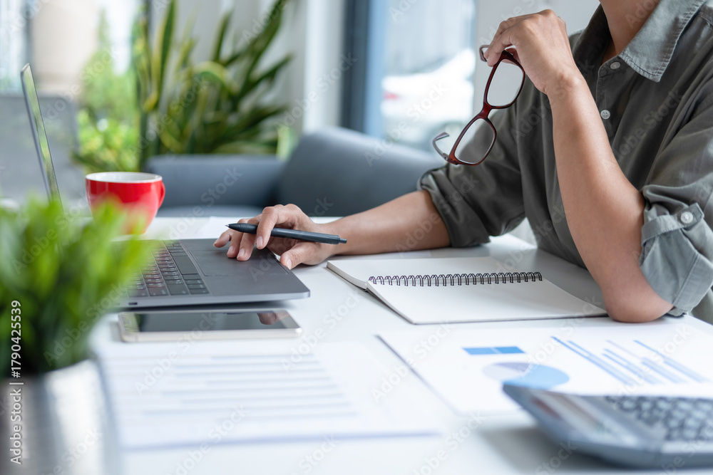 Businesswoman sitting at desk on couch in workplace or at home working on laptop and analyzing data on charts and graphs and writing on papers to make business plan and strategies for company #1790425539