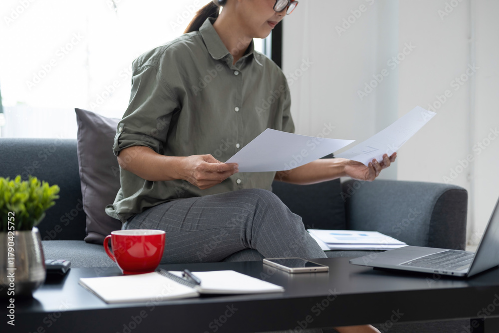Businesswoman sitting at desk on couch in workplace or at home working on laptop and analyzing data on charts and graphs and writing on papers to make business plan and strategies for company #1790425752