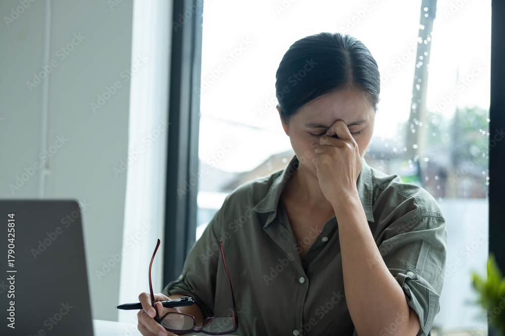 Businesswoman sitting at desk on couch in workplace or at home working on laptop and analyzing data on charts and graphs and writing on papers to make business plan and strategies for company #1790425814