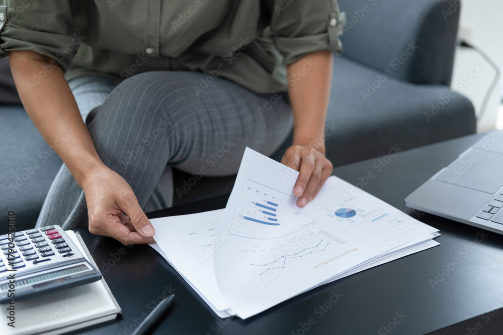 Businesswoman sitting at desk on couch in workplace or at home working on laptop and analyzing data on charts and graphs and writing on papers to make business plan and strategies for company #1790425880