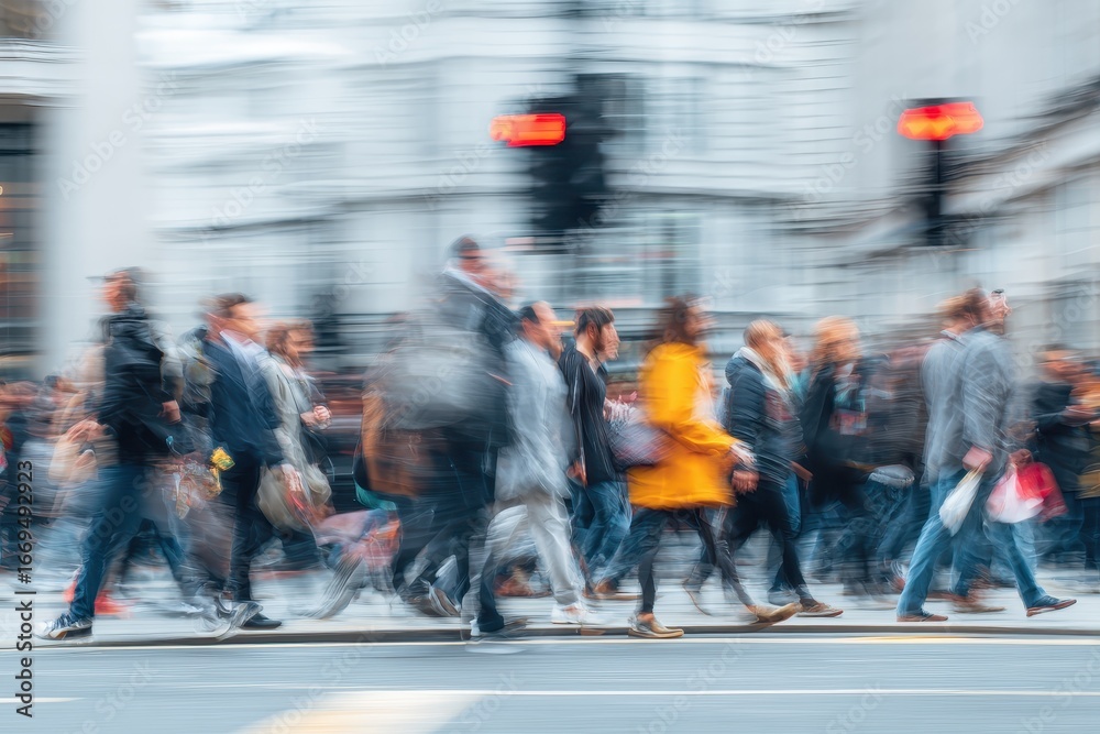Busy urban street filled with a diverse crowd of people walking briskly during the day #1669492923