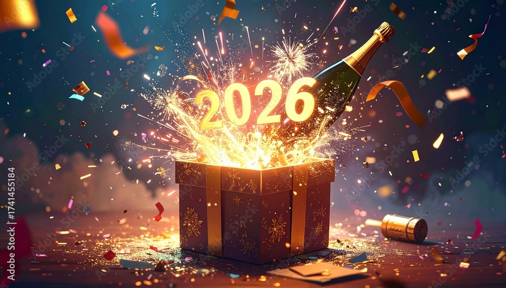 Caja de regalo envuelta que se abre llena de champán, confeti y un brillante 2026 #1741455184