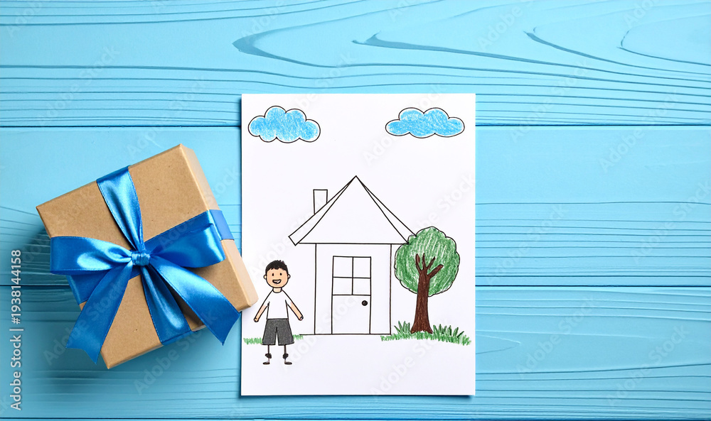 Caja de regalo sorpresa para papá y dibujo infantil de una casita, en concepto del día del Padre el 19 de marzo sobre una mesa de madera azul #1938144158