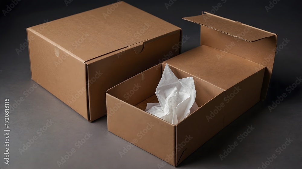 Cajas de cartón abiertas y cerradas con papel de seda en interior sobre fondo oscuro, concepto de embalaje y envío #1720813115