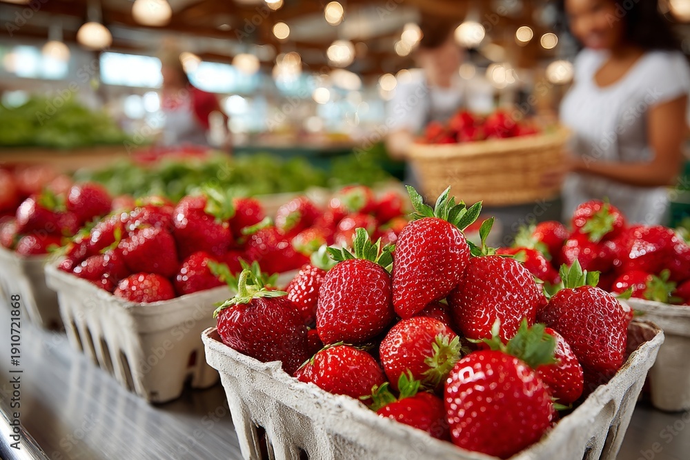 Cajas llenas de fresas maduras se exhiben en un mercado cubierto con ambiente cálido y compradores desenfocados al fondo. #1910721868