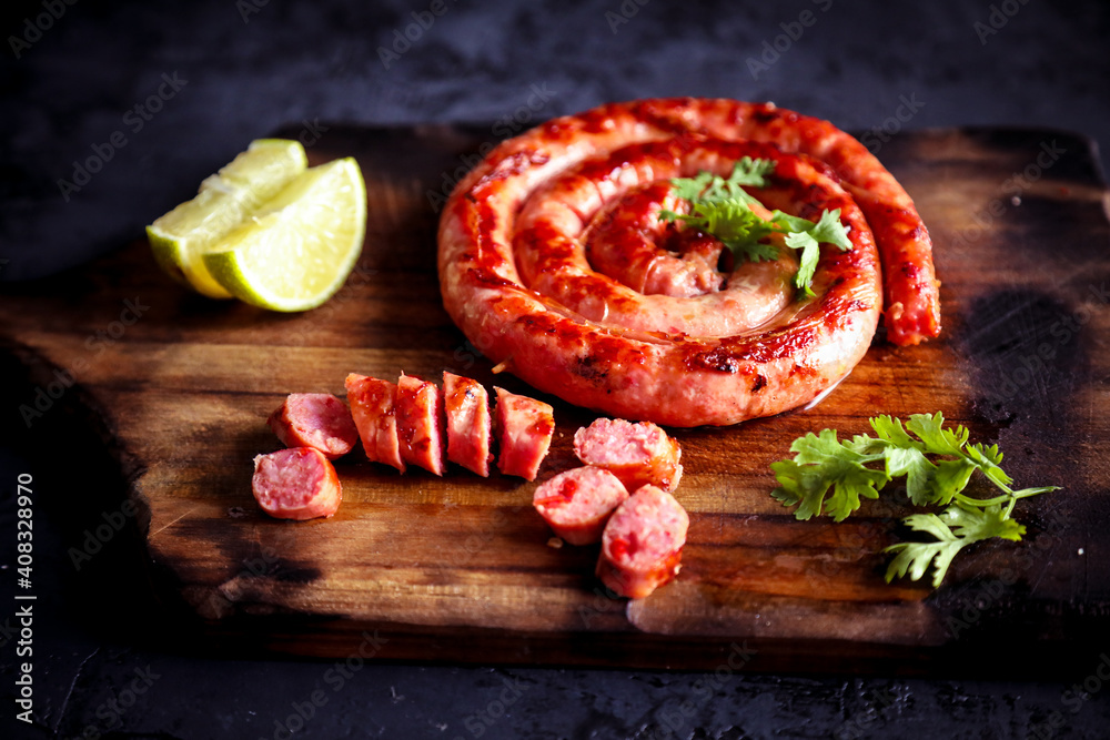 Calabresa grelhada na placa de madeira com especiarias. Delicioso churrasco brasileiro. #408328970