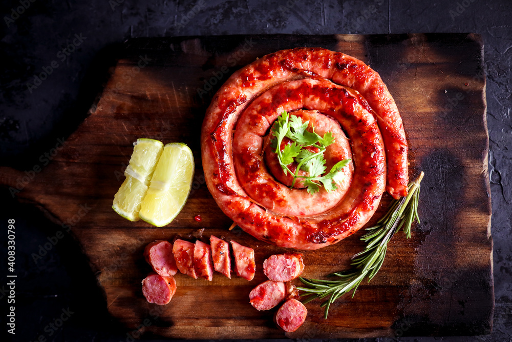 Calabresa grelhada na placa de madeira com especiarias. Delicioso churrasco brasileiro. #408330798