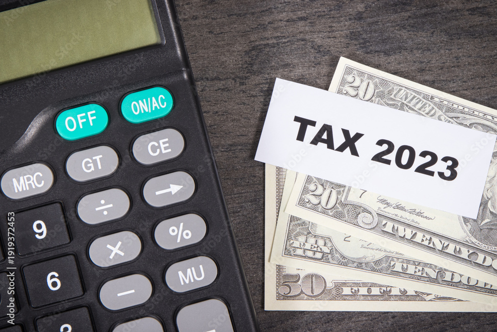 Calculator, inscription tax 2023 and dollar banknotes. Time of calculating, return or tax payment #1919372453