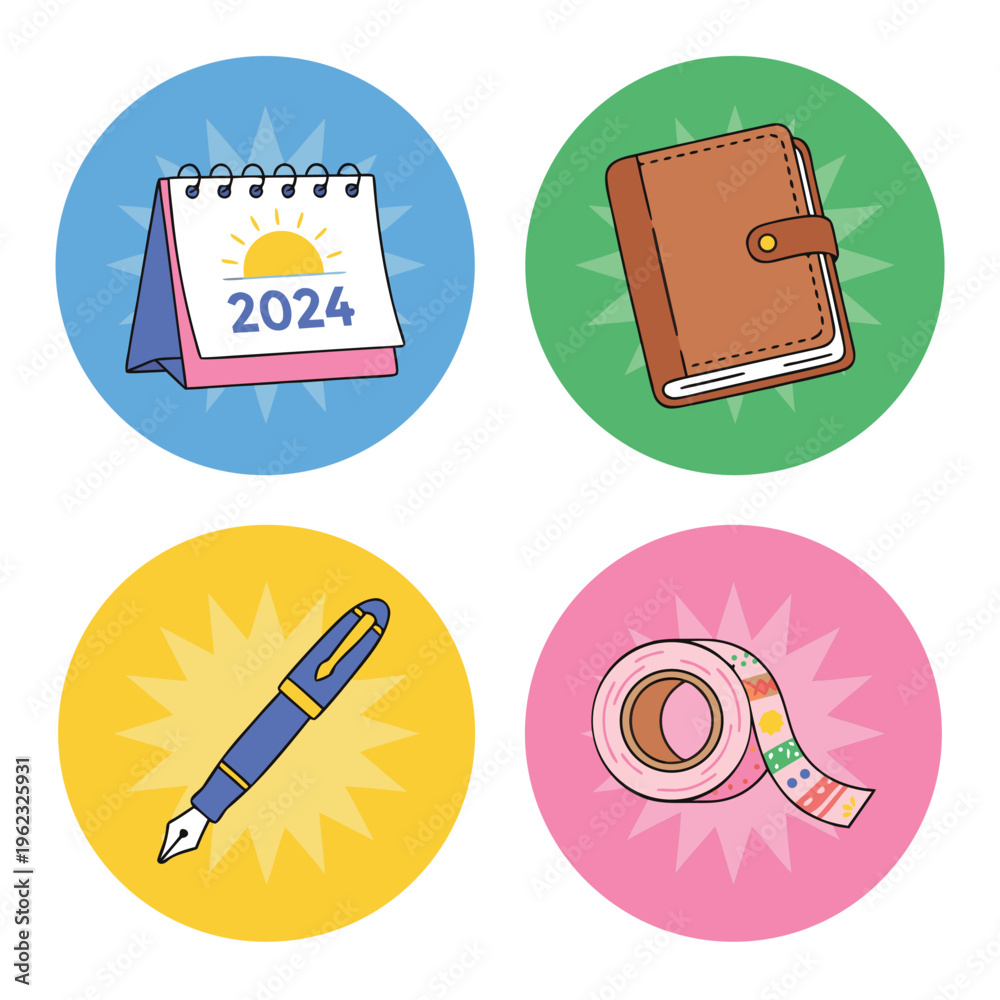 2024 Calendar, Notebook, Pen, and Decorative Tape Icons. #1962325931