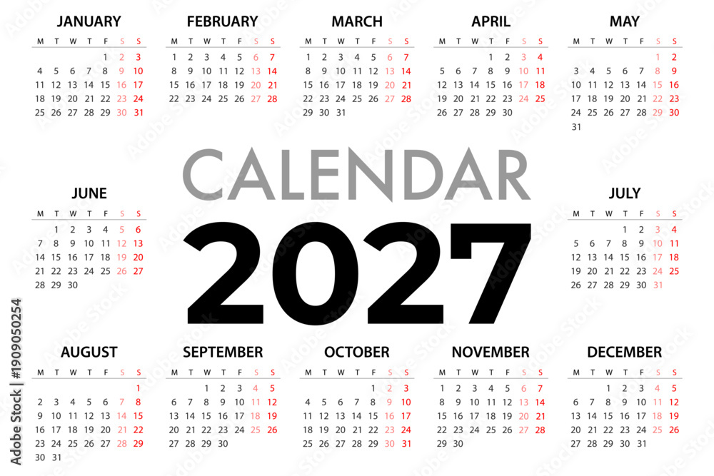Calendar planner for 2027 Week Starts Monday. Simple Vector Template eps 10. #1909050254