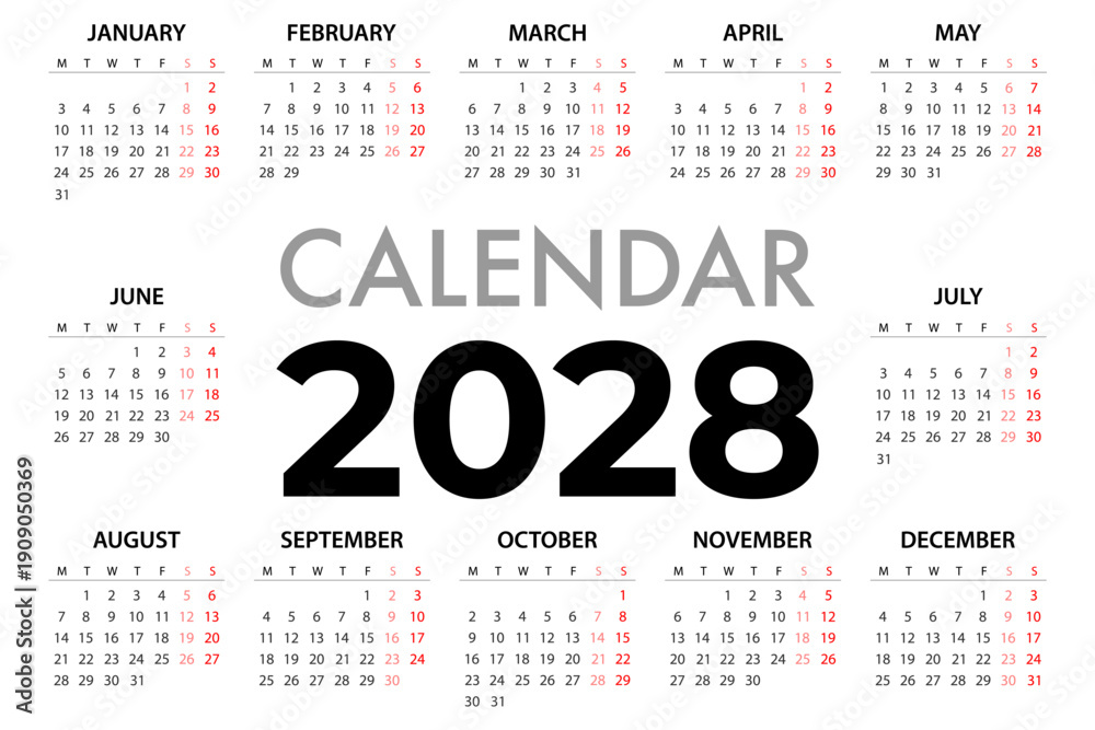 Calendar planner for 2028 Week Starts Monday. Simple Vector Template eps 10. #1909050369
