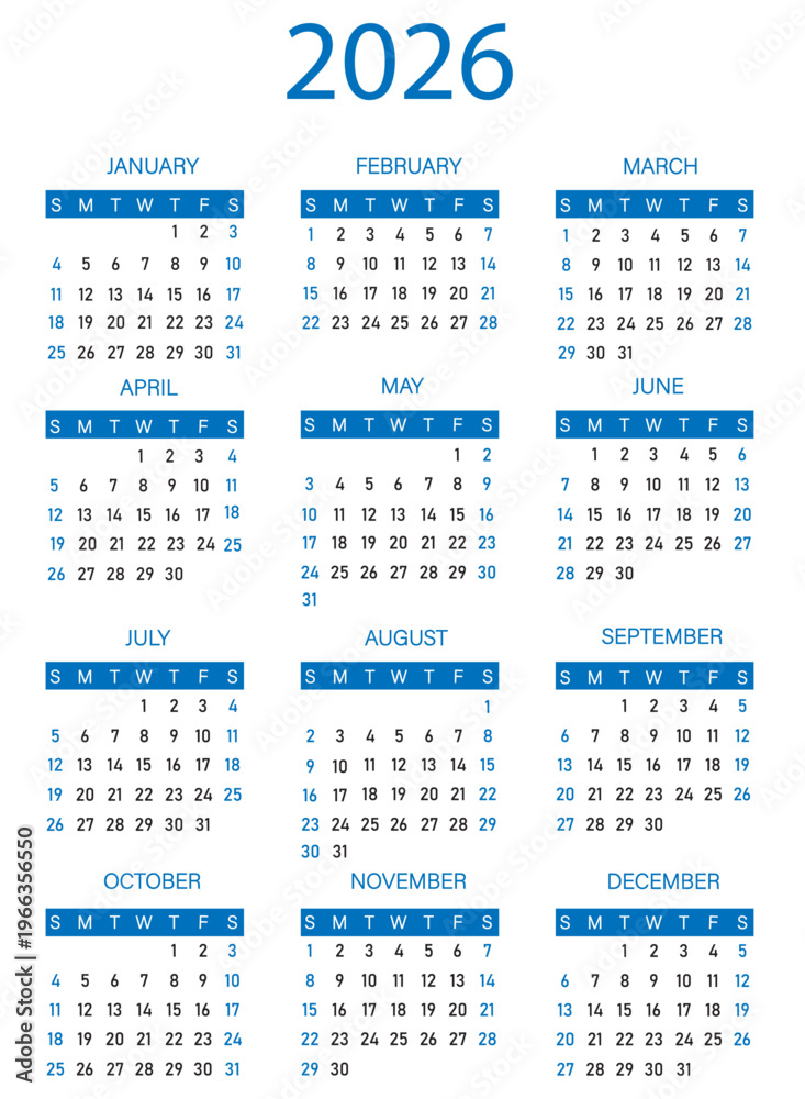 2026 calendar template with blue rectangle box | Three column month arrangement calendar visualization 2026 | Black and blue text vector illustration #1966356550