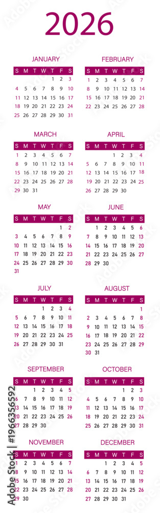 2026 calendar template with Crimson Violet rectangle box | Two column month arrangement calendar visualization 2026 | Black and Crimson Violet text vector illustration #1966356592