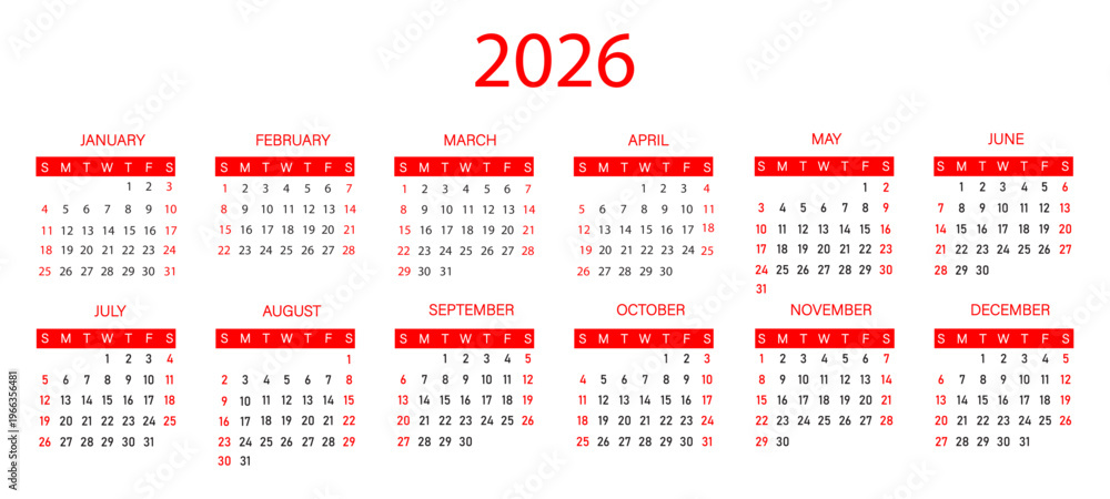 2026 calendar template with red rectangle box | Six column month arrangement calendar visualization 2026 | Black and red text vector illustration #1966356481