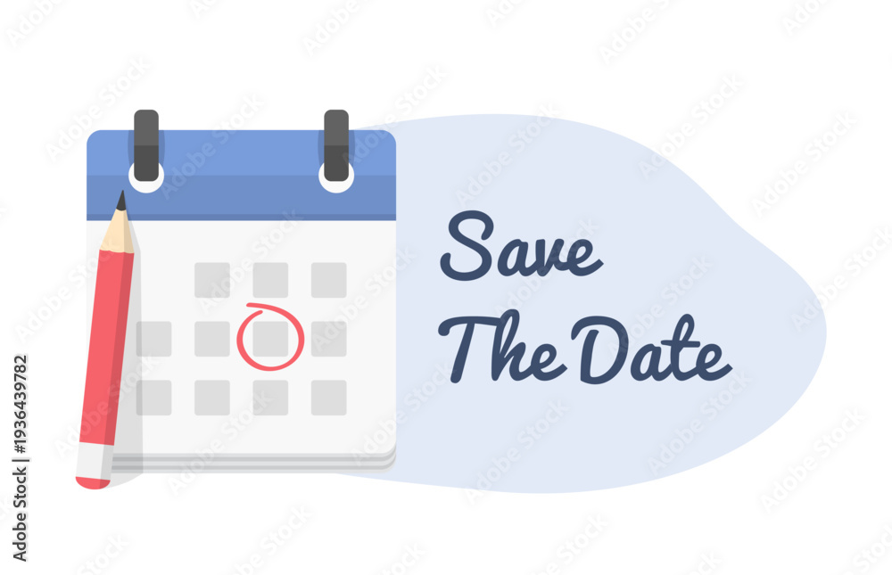 Calendar with pencil and circled date with Save The Date text for event invitation and reminder #1936439782