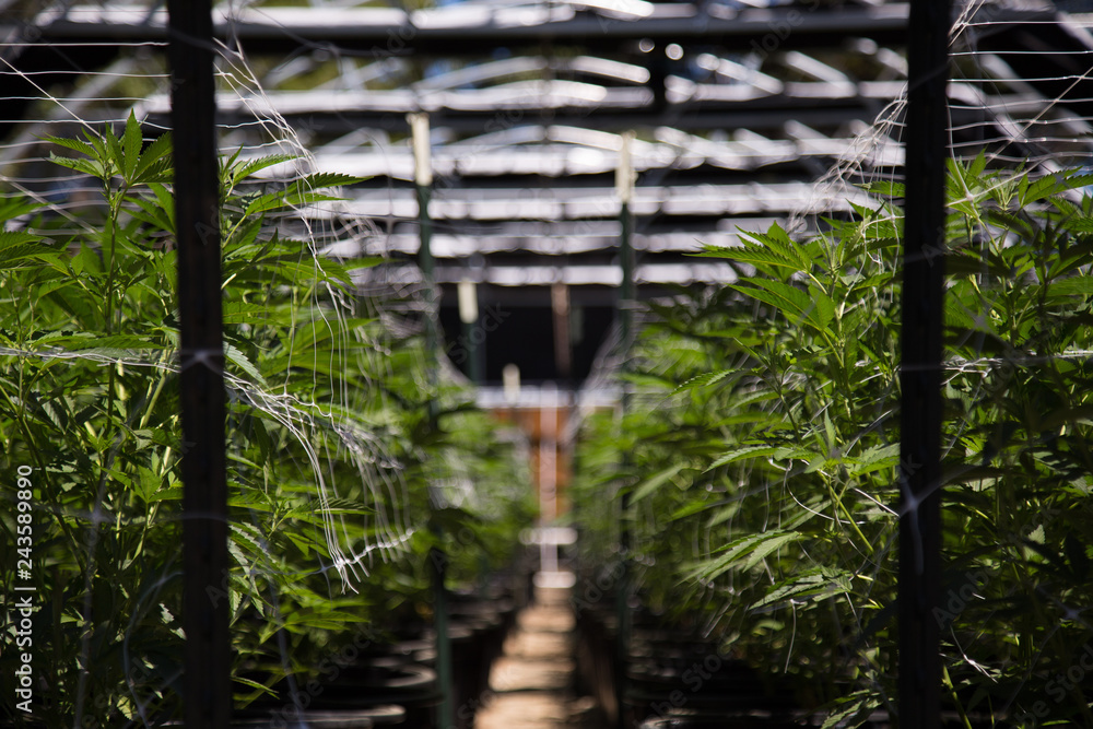 California cannabis cultivation at its finest. A close up of the marijuana farm industry. Beautiful macro and micro shots. Green house, outdoor, indoor plants and harvesting #243589890