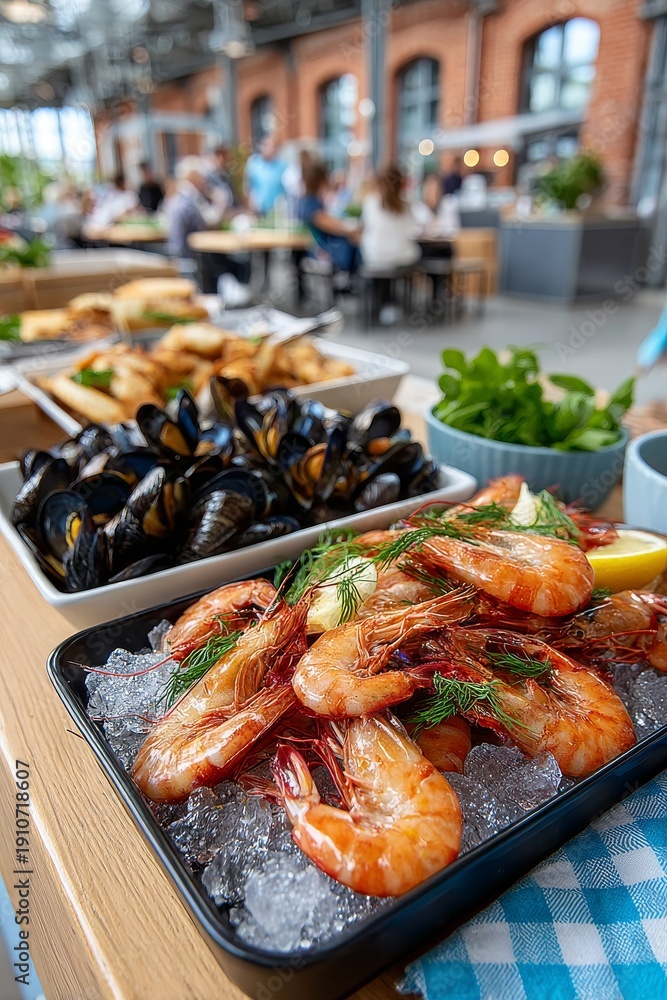 Camarones y mejillones frescos sobre hielo se exhiben en un mostrador de mercado con mesas y clientes al fondo. #1910718607