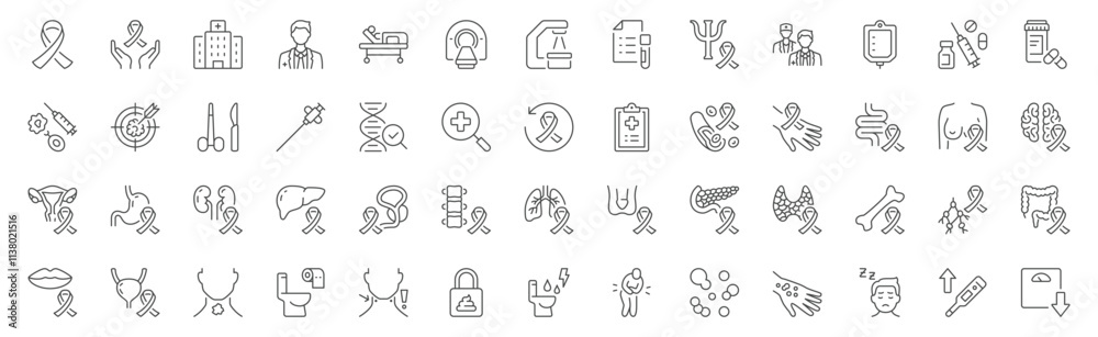 Cancer line icons. Vector illustration include icon - mri, doctor, treatment, biopsy, radiology, biopsy, sarcoma, therapy, radiology outline pictogram for oncology tumor diagnostic. Editable stroke #1138021516
