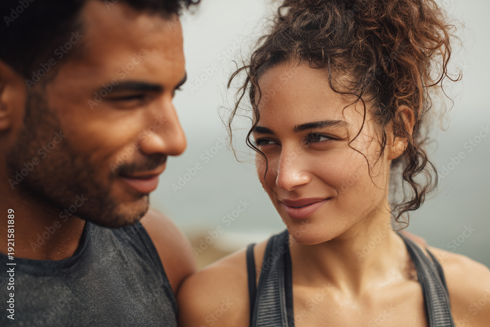 candid medium close-up portrait of a sweaty Latino man and Middle Eastern woman in athletic wear sharing a tired happy glance on a coastal path against a blurred blue ocean background #1921581889