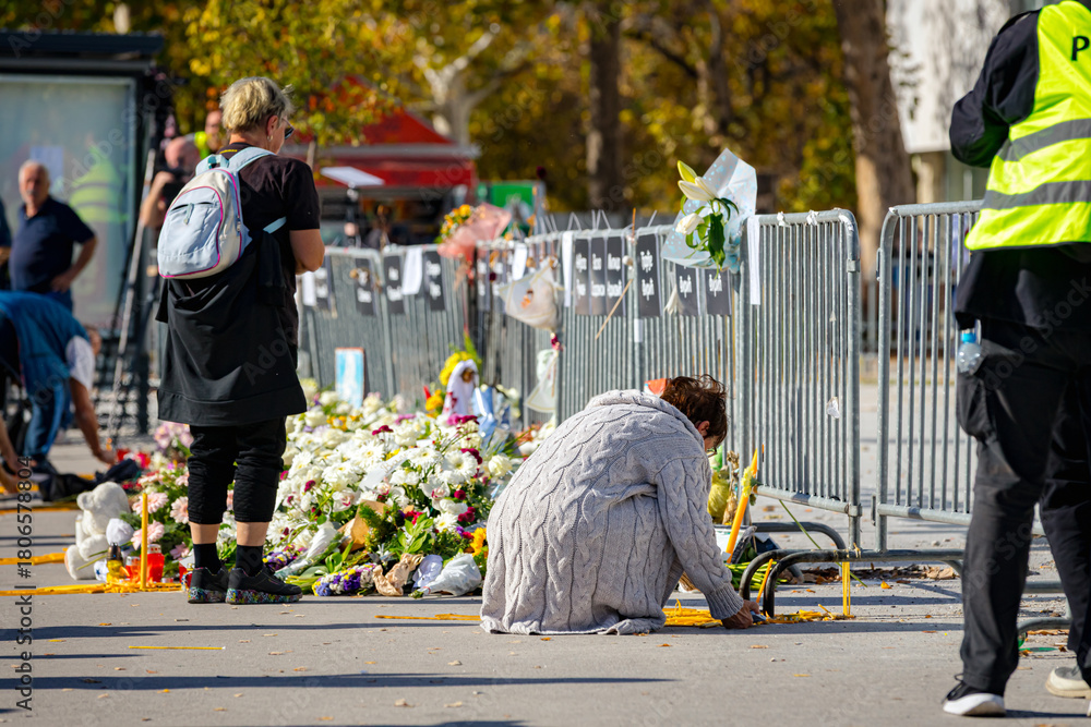 Candles and pile of flowers at the place where the accident happened #1806578804