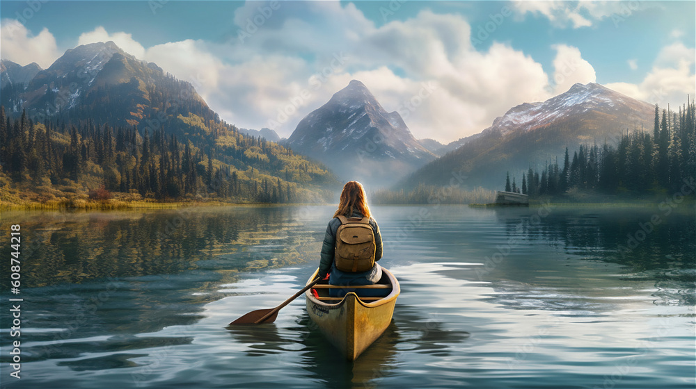 canoeist driving lonely through deserted dreamlike lake landscape with mountains in background, generative AI #608744218