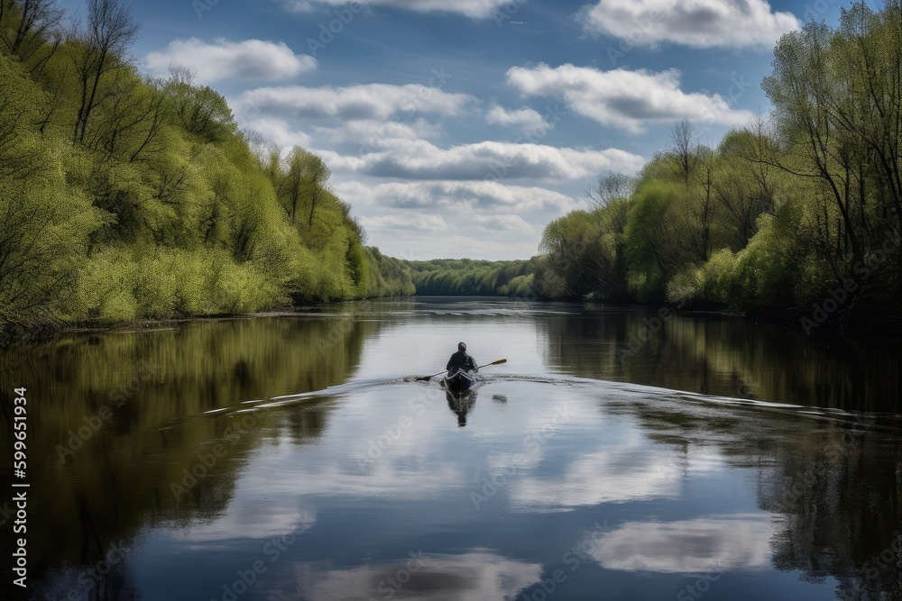 canoeist paddling down clear and calm river, with tranquil setting, created with generative ai #599651934