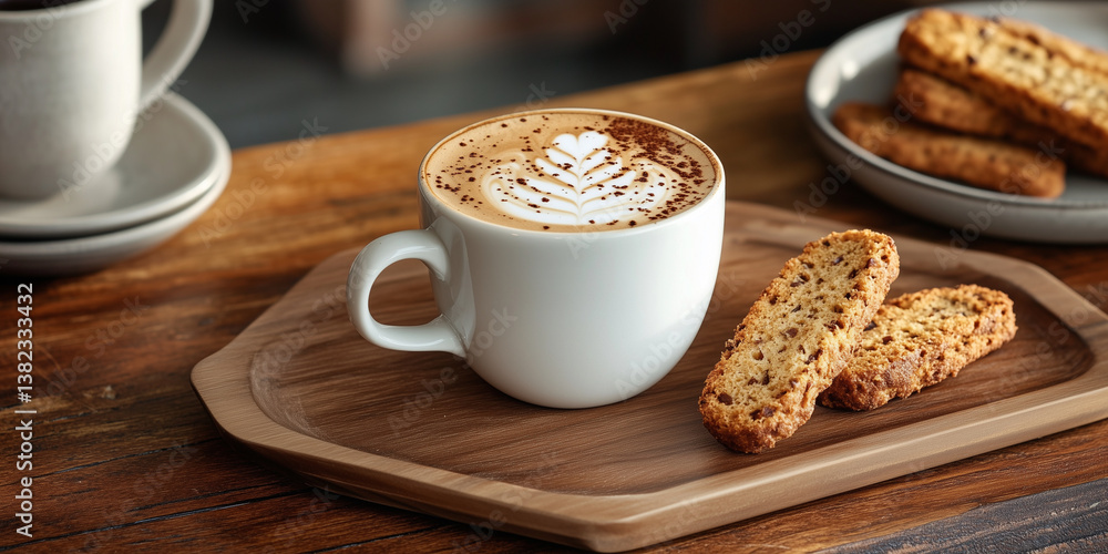 Cappuccino mit Latte Art, serviert mit knusprigen Biscotti auf einem Holztisch #1382333432