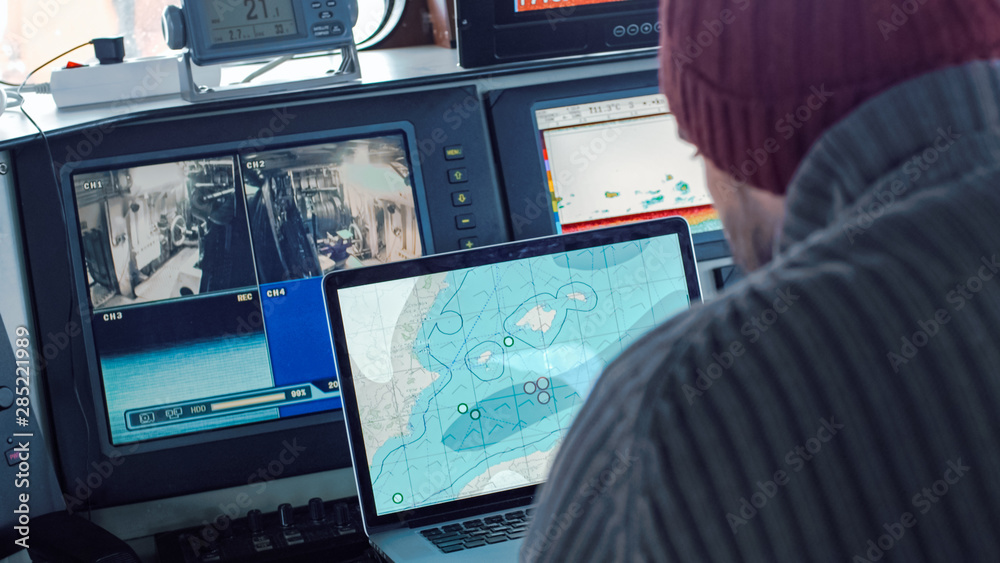 Captain of Commercial Fishing Ship Surrounded by Monitors and Screens Working with Sea Maps in his Cabin. #285221989
