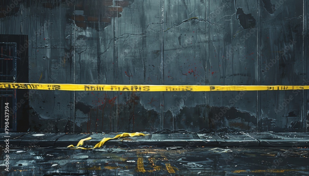 Capture the intensity of a rear view crime scene with a yellow police line banner stretched across the scene, emphasizing the concrete wall as a backdrop Use acrylic to bring out the depth and drama, #798437394